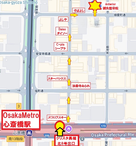 左側に「スワロフスキー」さんがあるので、そこから商店街の中を北へ(本町駅方向へ)歩いてください。